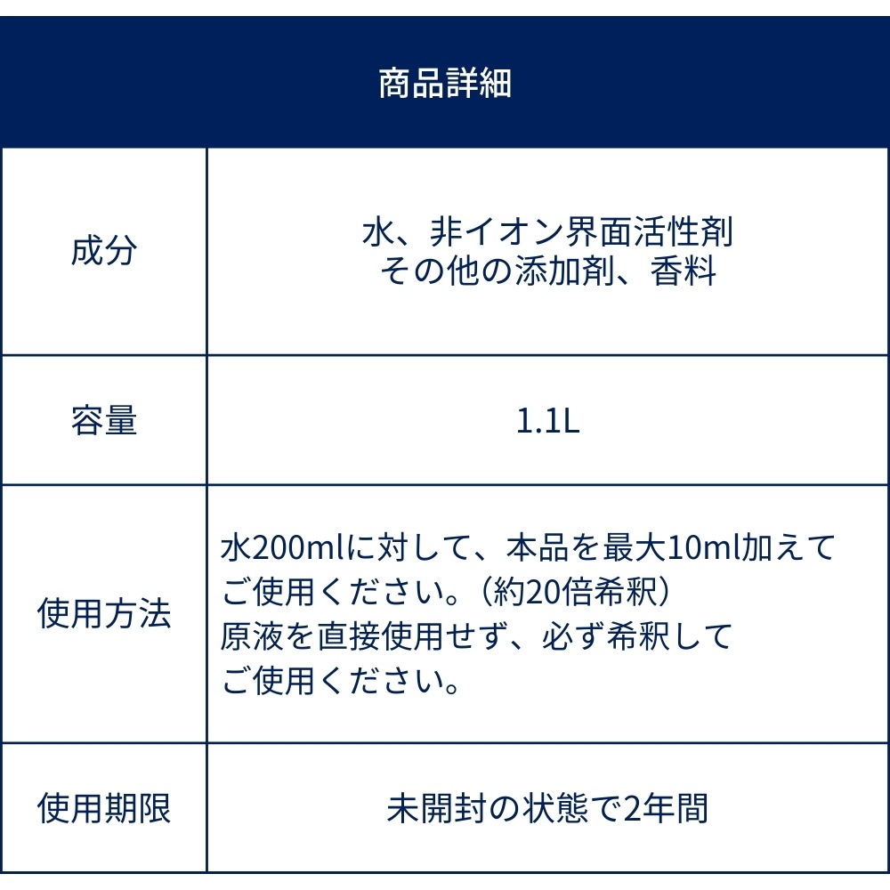 本製品は濃縮タイプです。必ず水で薄めてご使用ください(希釈比率 1:20)。