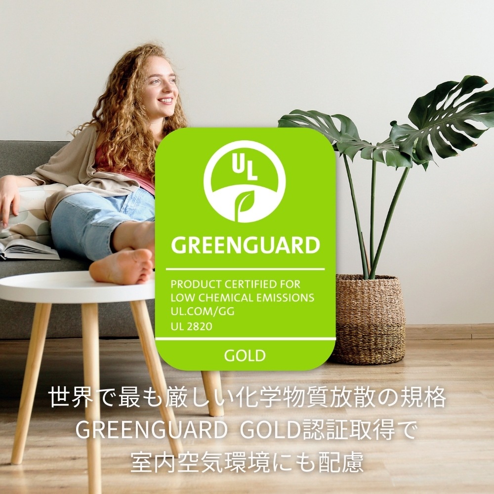 「UL GREENGUARD認証」は、世界で最も厳しい環境基準のひとつと言われており、家族やペット、そして地球にとって安全な製品であることを確認するもので、 VOC排出量が非常に少なく、室内の空気環境を改善します。